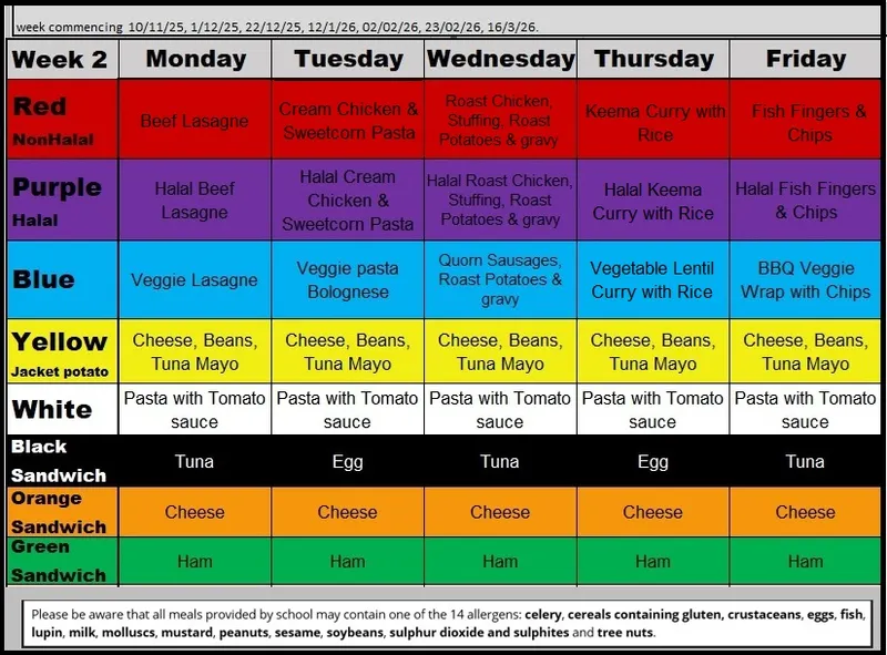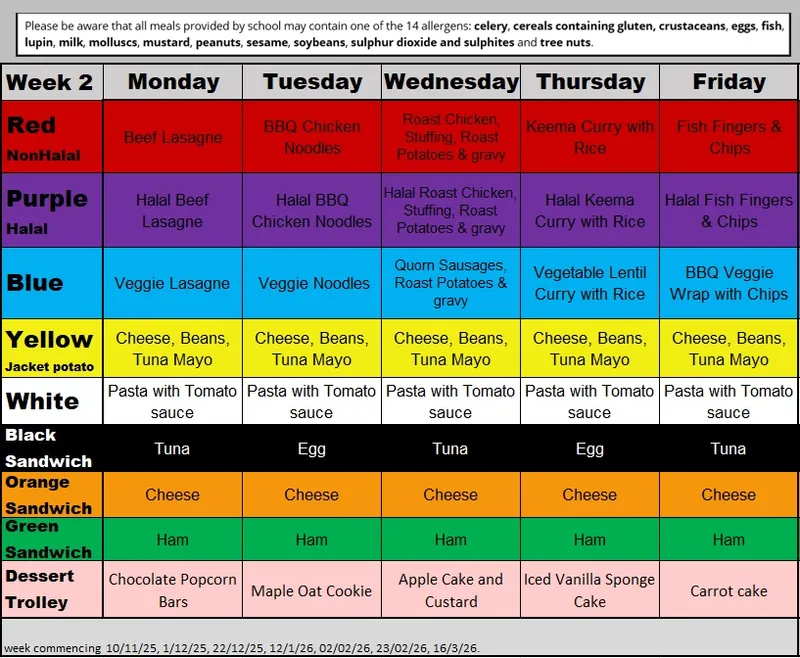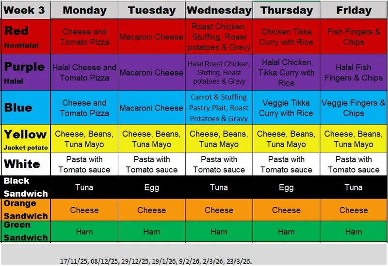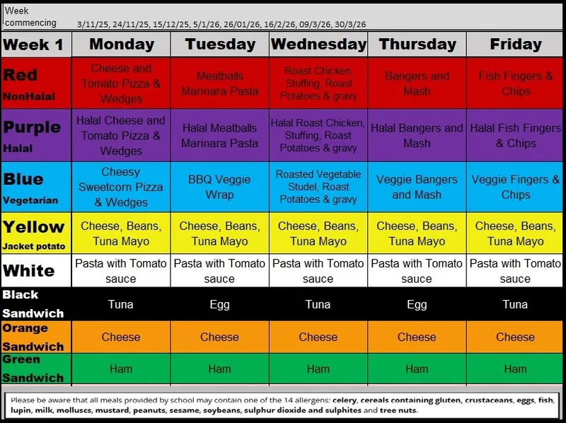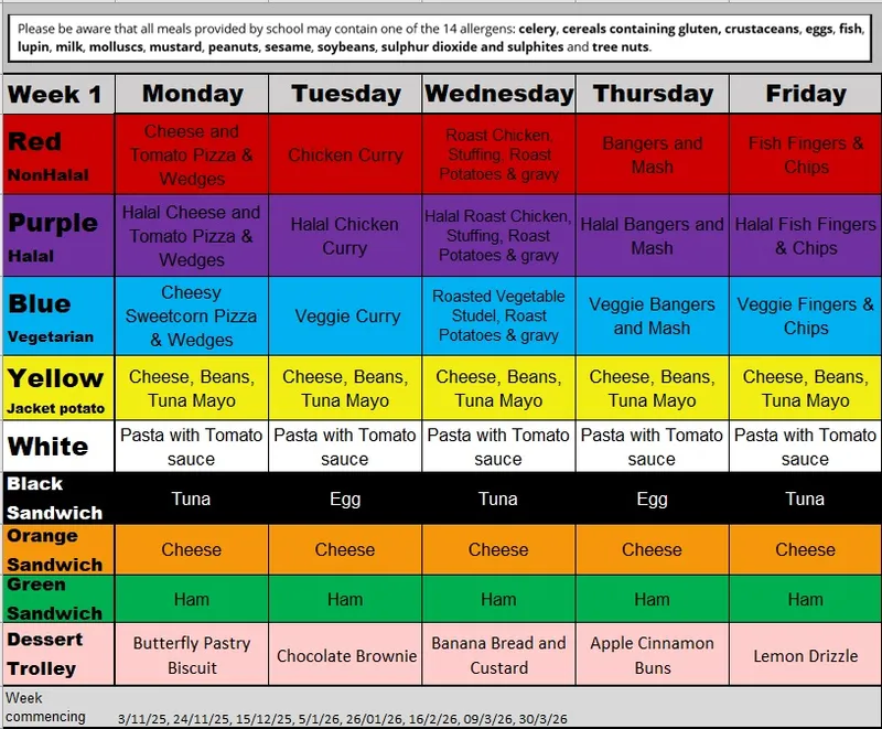 The school menu rotates on a three-week basis and refreshes for Autumn/Winter and Spring/Summer seasons.